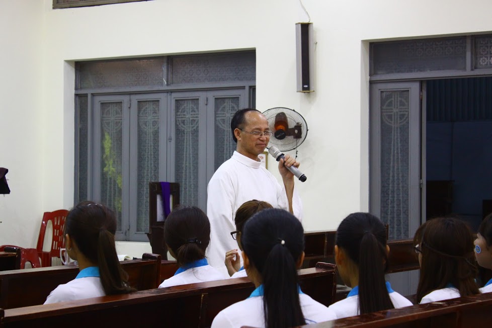 Đúng 14h các bạn sinh viên bước vào giờ tĩnh tâm. Với chủ đề tĩnh tâm “đức tin không có hành động là đức tin chết”. Cha Gioan hỏi các bạn sinh viên: theo các con có bao nhiêu người tin là có chúa? Người bên lương có tin có Chúa k? Trời là ai? Trời ở đây có nghĩa là Chúa. Vậy theo các con: cộng sản tin có Chúa không? Cha nói, nếu như cộng sản không tin có Chúa thì họ giết các cha, các thầy lâu rồi. Người cộng sản tin có Chúa hơn các con. Họ tin lắm, họ luôn lấy các gương các cha làm gương mẫu cho các đảng viên. Cha hỏi tiếp: ma quỷ có tin có Chúa không? Ma quỷ còn tin có Chúa nữa là những người vô thần. Vậy số người tin có Chúa có nhiều không? Ma quỷ tin có Thiên Chúa, người vô thần tin có Thiên Chúa. Vậy cha hỏi các con người ta tin có Chúa, thế các con có tin có Chúa không? Làm sao biết ta có đức tin? Chúng ta tin là có Lê-nin không? Tin ai cũng có thể tin được. Tin có chưa đủ, tin vào chưa đủ, mà còn phải tin yêu. Tin mà phải yêu, vậy các con tin có, tin vào hay tin yêu?
