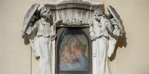 Bức bích họa được vẽ từ thế kỷ 17-18, và hiện được sùng kính với tên “Đức Mẹ thông ban ơn Chúa” hay “Đức Bà cản bom”. Tác phẩm này được đặt ở khu vực giữa cung điện Thánh bộ Giáo lý đức tin và lối vào Nguyện đường Thánh Phêrô, được treo trên tường kế cận một khu vườn nhỏ. Nguyện đường đã yêu cầu Tòa Thánh đặt tác phẩm vào một khung hình mới bằng hoa cương, giữa hai tượng thiên thần lớn, tay cầm khiên có đinh.